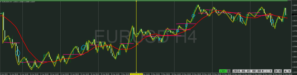 ・点線を抜けると上目線でトレンド転換シグナルになる