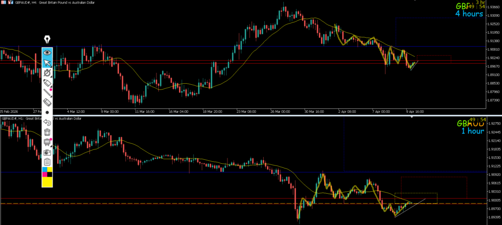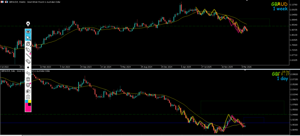 4h水平線で止まれば戻り売りを考えていきたいがその場合1hMAを上抜けてしまう為微妙になる、ピンクのダウカウントの4h安値で見られている可能性もあるのでこのまま1hMAに抑えられて攻防ラインに下降して来れば攻防ライン抜けでのエントリーを考えていきたい