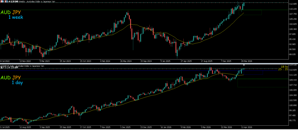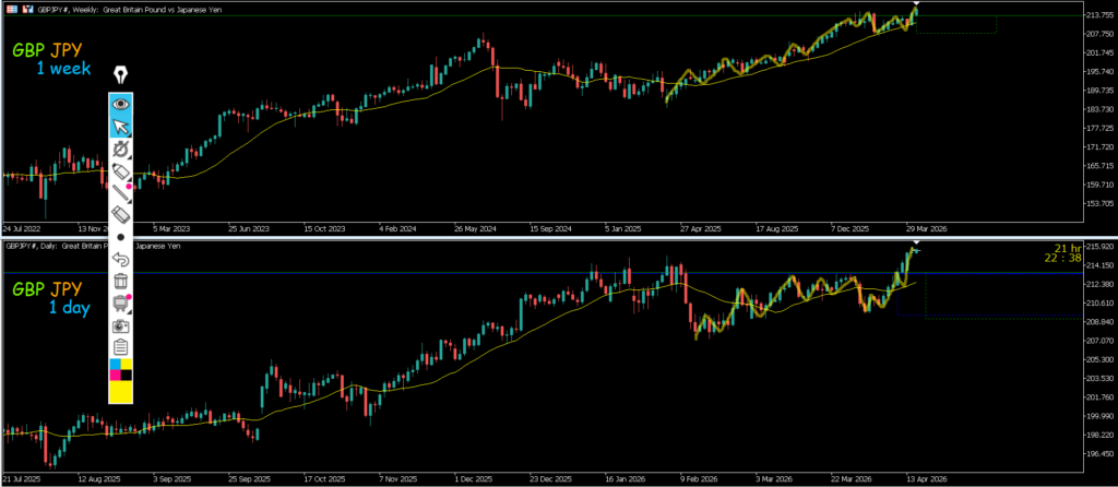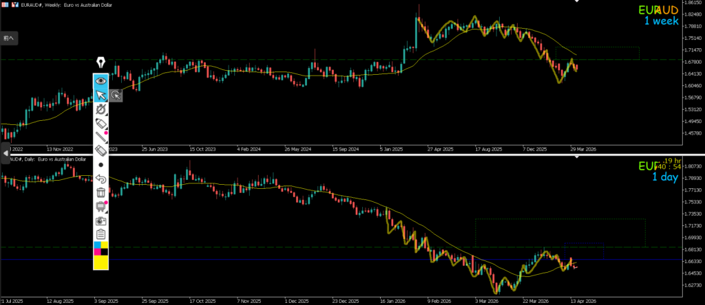 緑が週足 青が日足 赤が4h 黄色が1h
