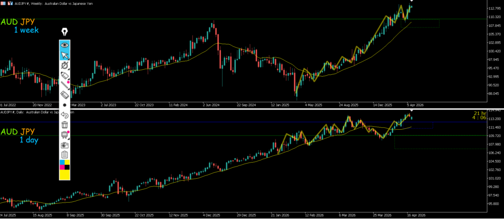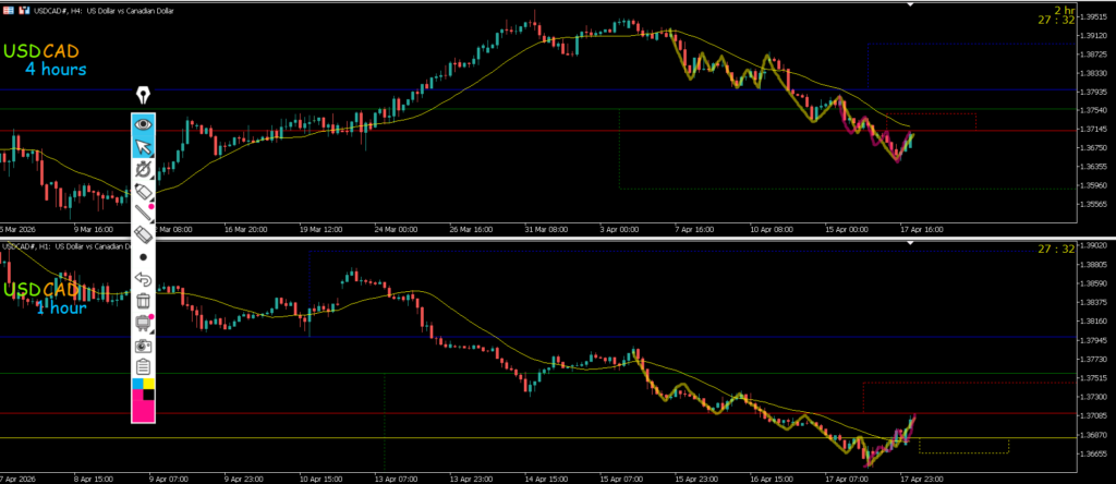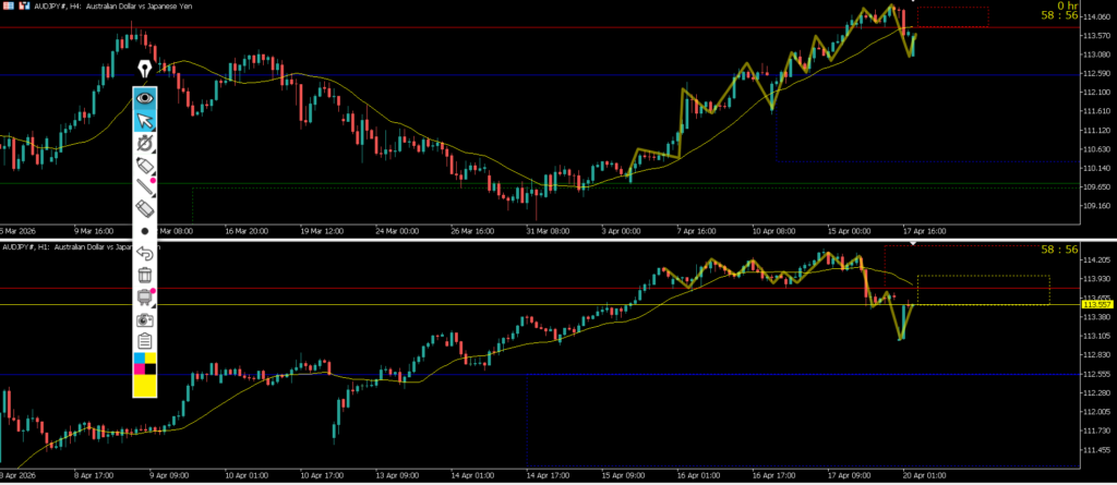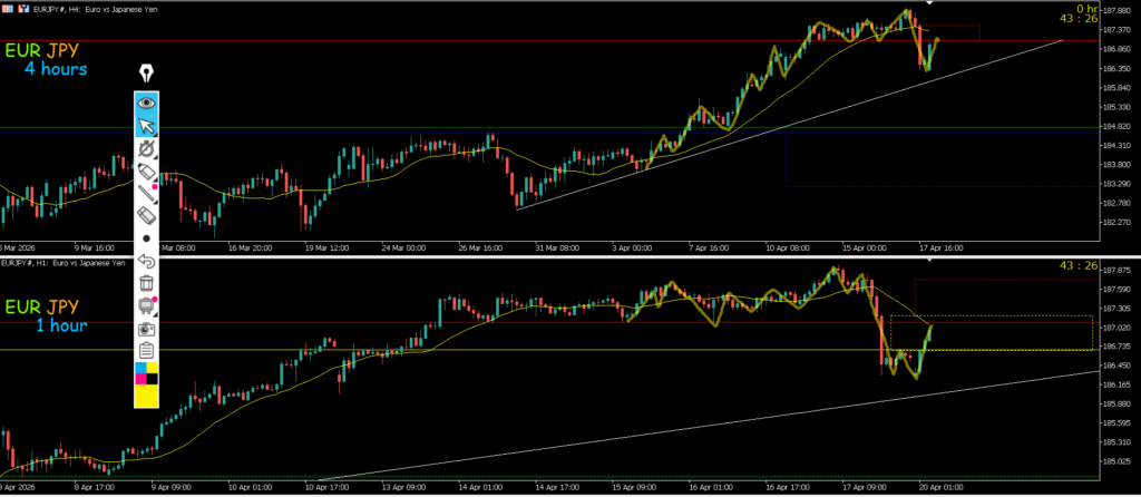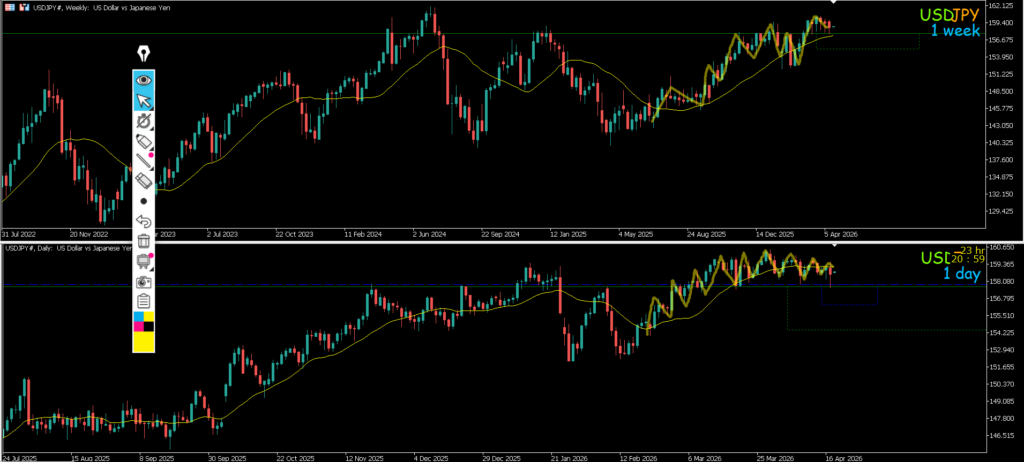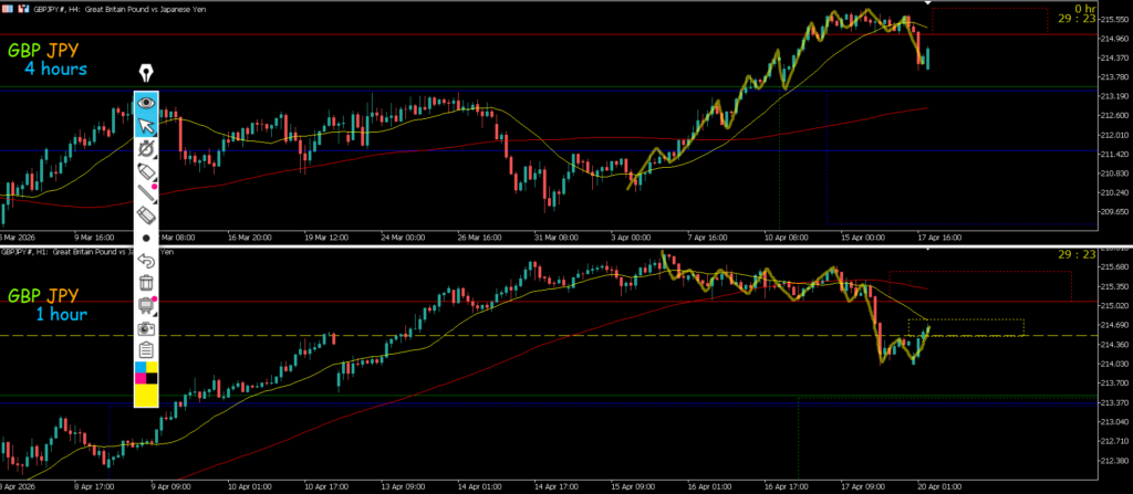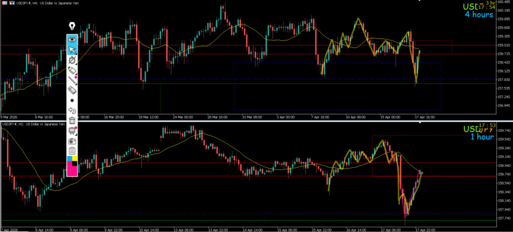 4h止まれば日足のサポートラインまでの戻り売りを1h反転から考えていきたい