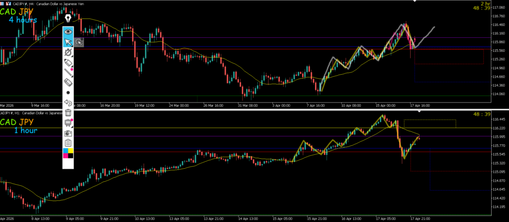 カナダ円は4h全戻しにも小さく見て戻り売りにも大きく見て白のダウカウントで押し目買いにも見えるのでやめた