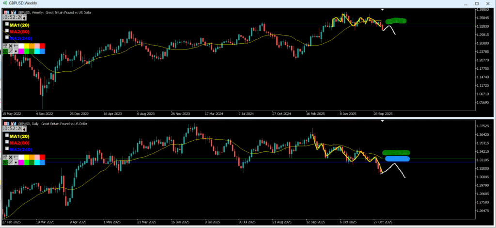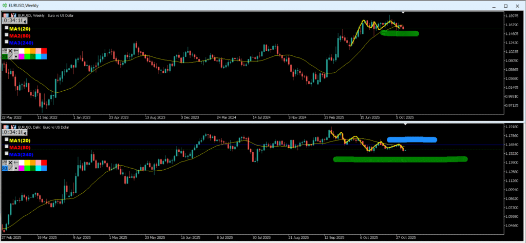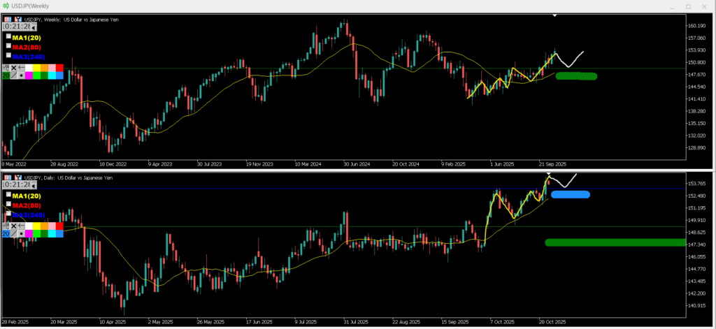 ・青ラインへ来ると止められやすく押し目買いになりやすい、その際にMAに買い支えられる可能性がある。