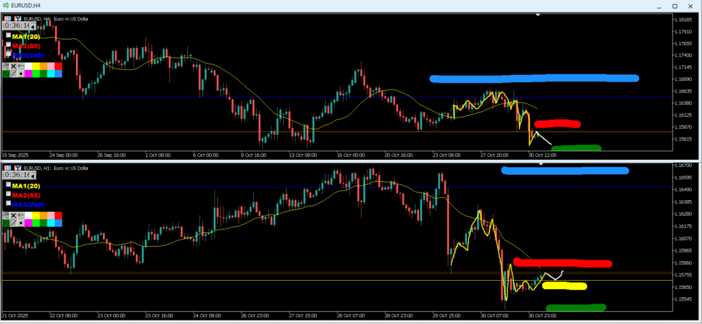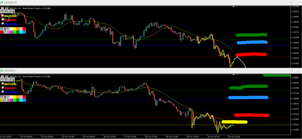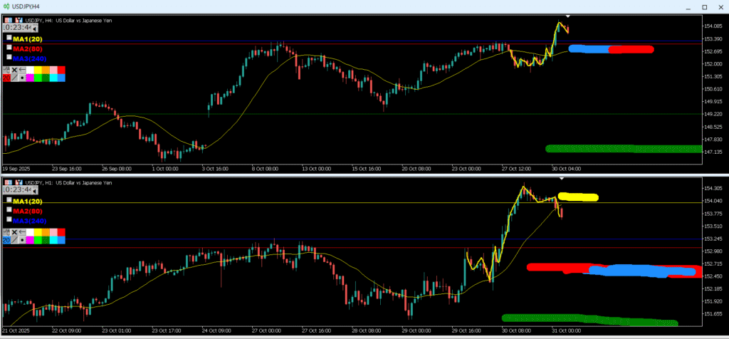 ・戻しを付けて来た場合MAの位置的に1h水平線ではなく赤ラインの4h水平線で止まりやすく戻り売りになり