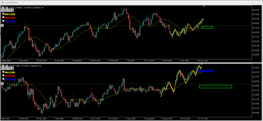 ・青ラインへ来ると止められやすく押し目買いになりやすい。