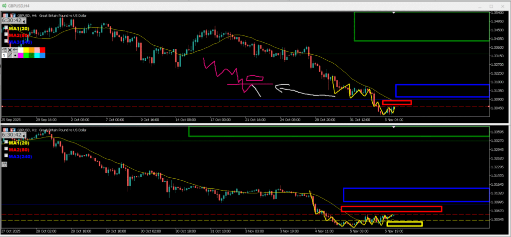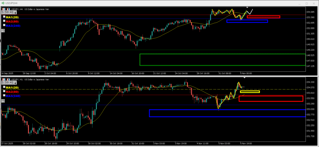 狙うのであれば1h戻り売りの下降トレンドから入ると思うが、今はするレベルではないのでやめておく4h明確な高安抜けまで待つ