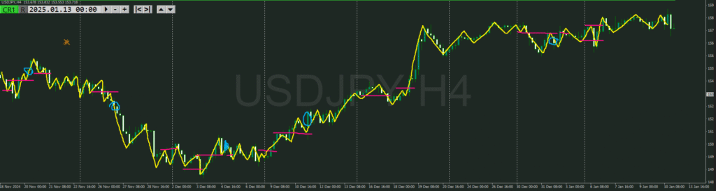 ・黄色ライン抜けで上目線トレンド転換シグナルになる