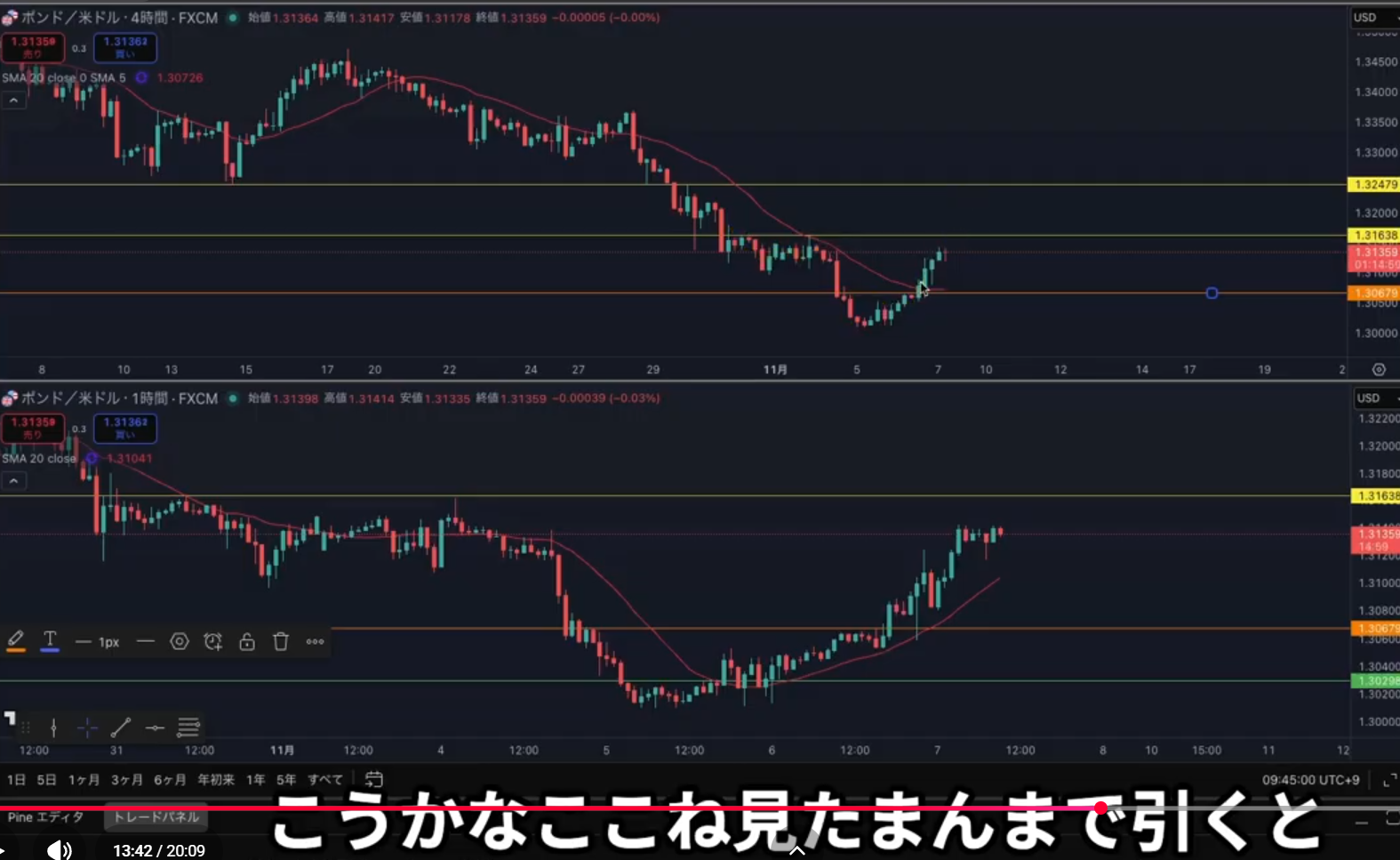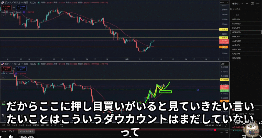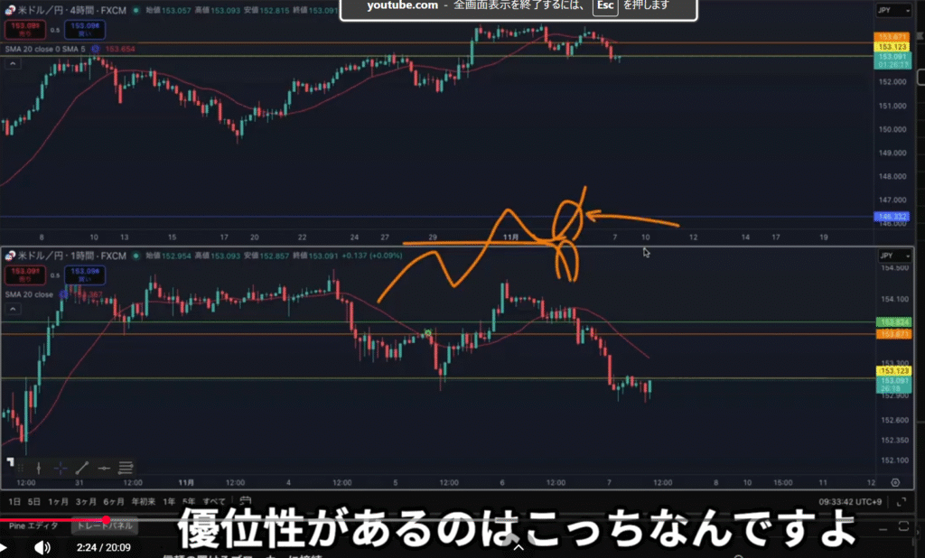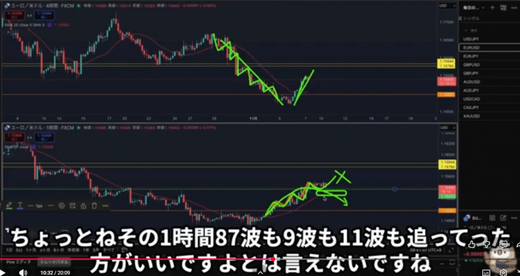 日足が上昇や下降の時4hで波を追いかけるのは良いけど、4hが上昇や下降の時は1hで波を追いかけてはいけないなぜなら1hはすぐに反転してしまうから。
