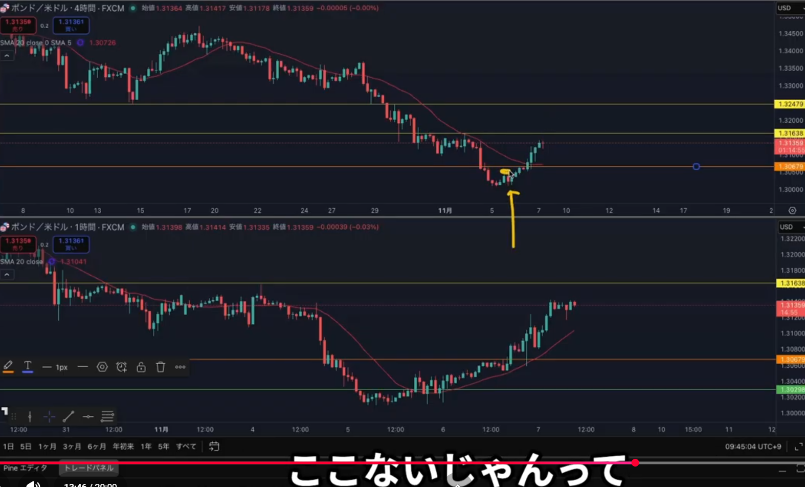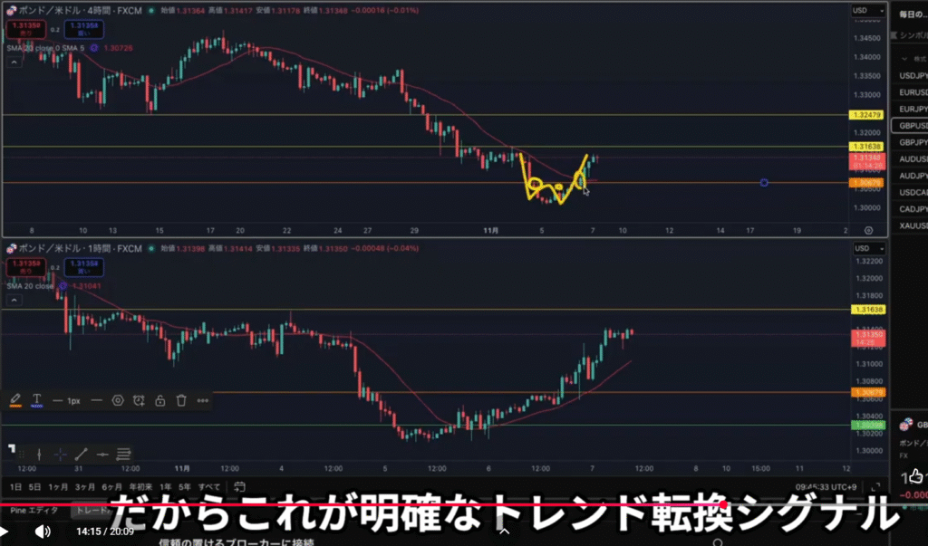 ・黄色ライン抜けで下目線トレンド転換シグナルになる