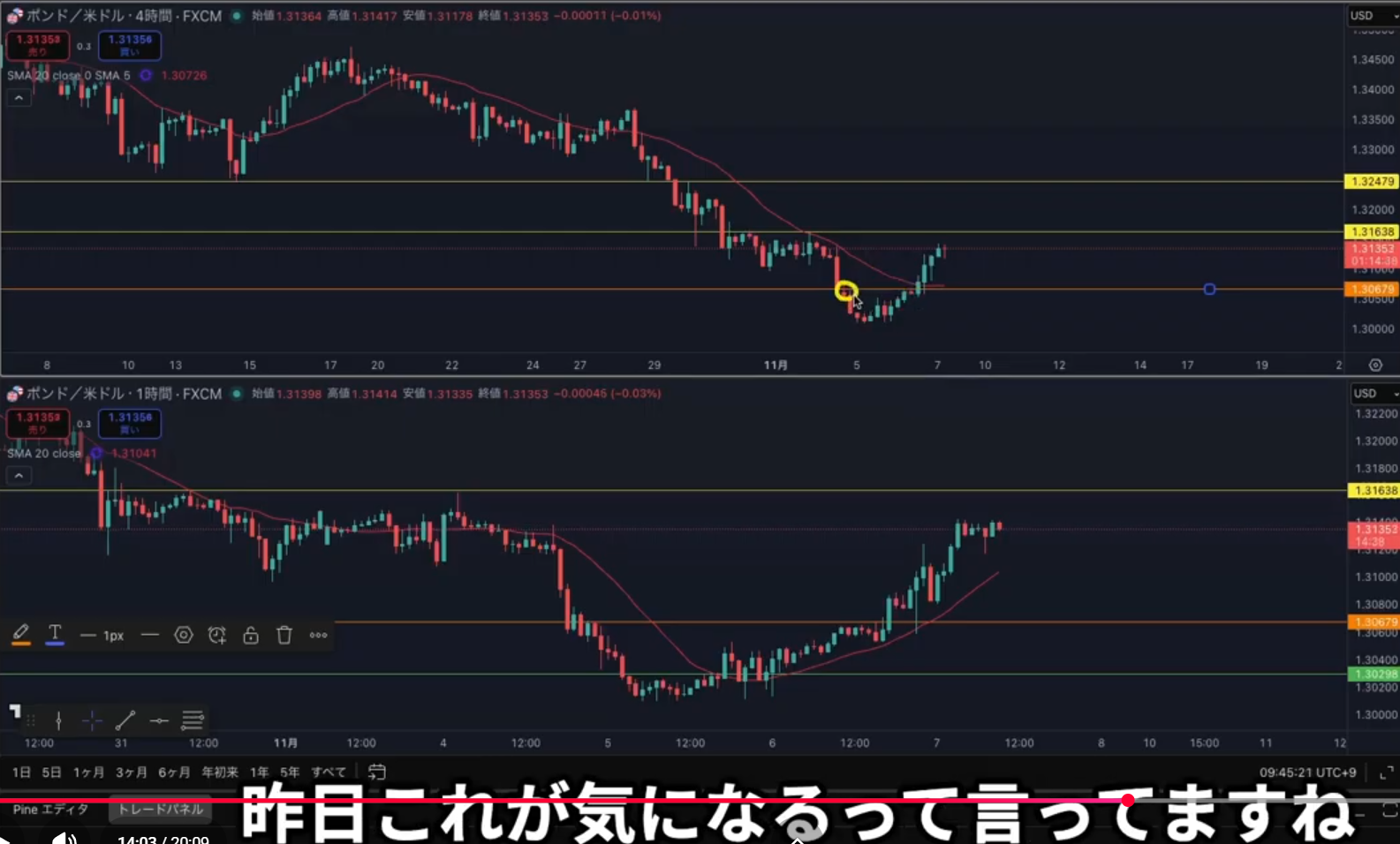・黄色のライン抜けで下目線トレンド転換シグナルになるがMAが支えてくる可能性があるので卵になりやすい