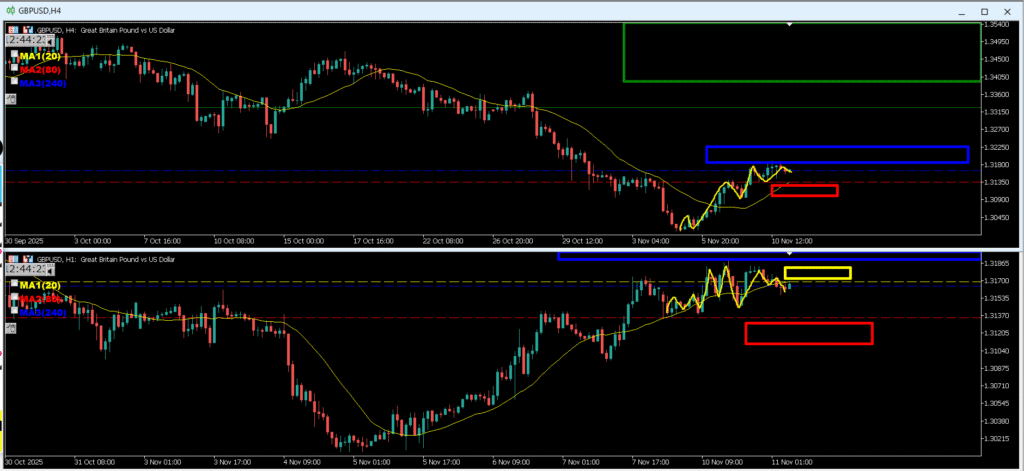 4hが日足のレジスタンスラインで止められている、4h調整なので1hで上昇トレンドが発生すればエントリーの場面ではあるが、上位足が共に下なので絶対に狙う所ではない。