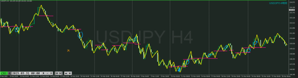 ・黄色ライン抜けで上目線トレンド転換シグナルになる