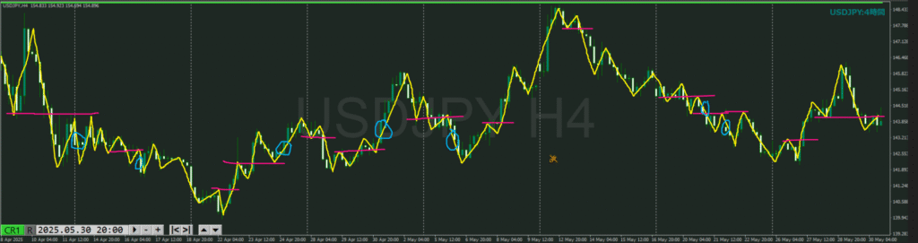 ・黄色ライン抜けで上目線トレンド転換シグナルになる