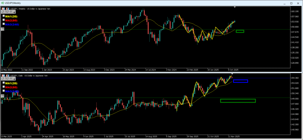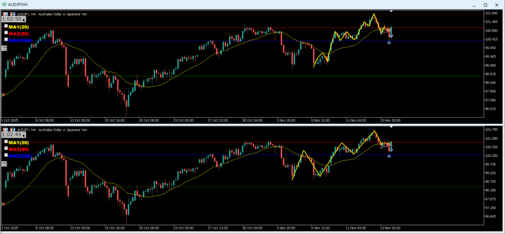 ・青のラインへ来ると止められやすく押し目買いになりやすい。