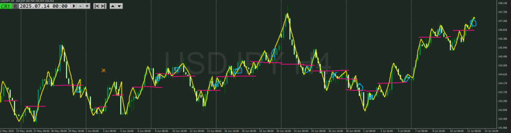 ・黄色ライン抜けで上目線トレンド転換シグナルになる