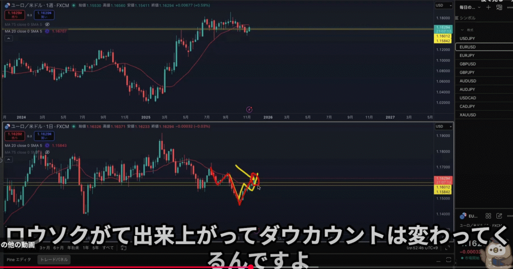 ローソク足が出来上がってダウカウントは変わってくる、ダウカウントが複数の場合正解は無く後からローソク足を見てこうだったかなと思う、ダウカウントの様々なパターンの仮説を立ててその仮説の精度を高めていく、そしてその精度が高いなと自分で思えるようにする!