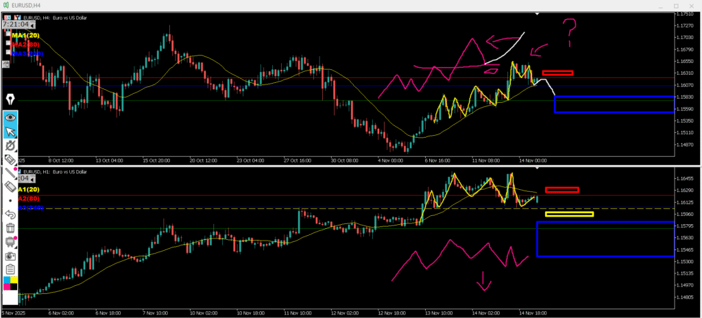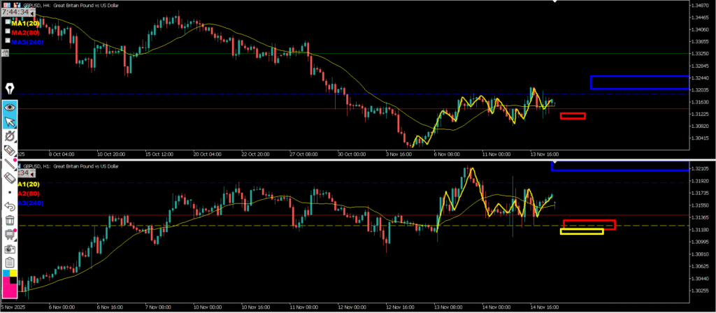 4h押し目買いの波の途中すぐ上に日足のレジスタンスラインがあるので伸びるかは微妙、ただ4hMAは支えてきているがここからは静観。