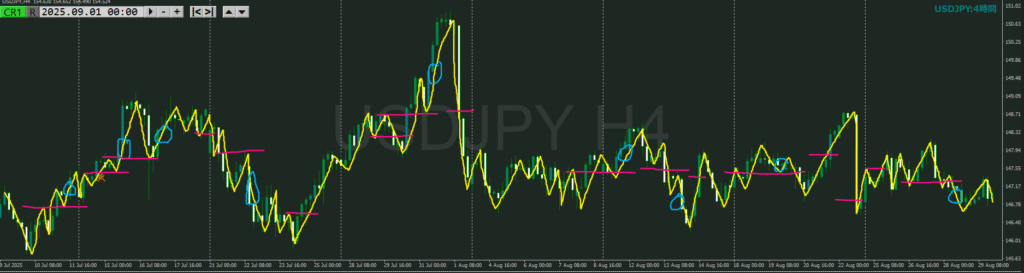・黄色ライン抜けで上目線トレンド転換シグナルになる