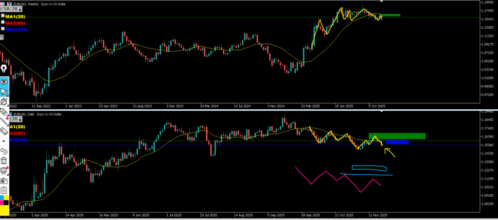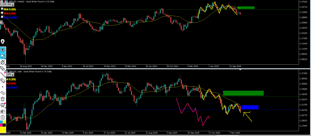 ・昨日までは塾長の言われていたピンクのダウカウントの全戻しで考えていたが、矢印のローソク足がトレンド転換シグナル感じたので黄色のダウカウントで安値抜けと見ていきたい。