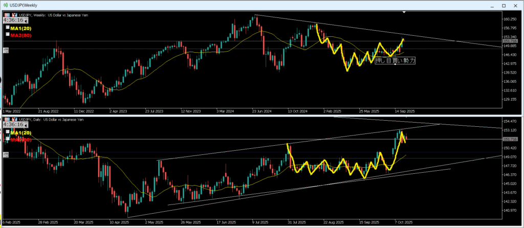 チャネルの下限も今現在抜けたので週足日足の押しの下落になれば、週足日足の資金が入って来てかなり下落して行きそう。