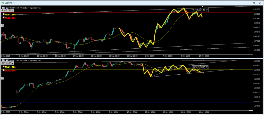 方向は下で戻り売りの波の途中で安値を抜けてきたら戻り売りを狙いたいが上位足は共に上目線、引き続き週足日足の押しの下落を取りに行くトレードだと思う。
