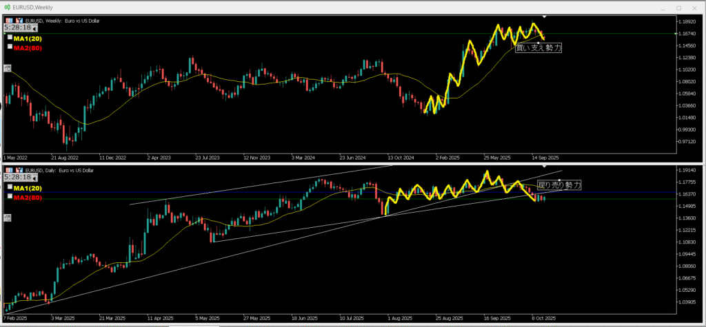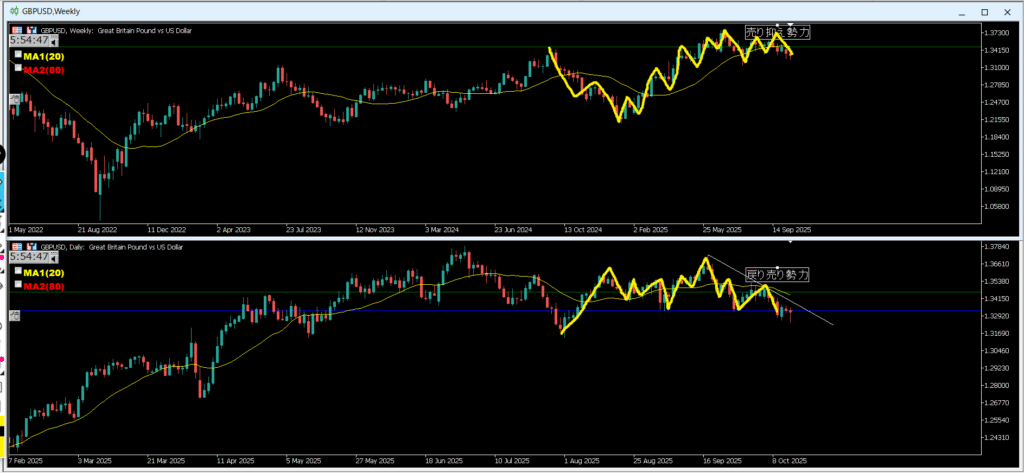 方向は下三尊で安値抜けからの戻り売りだが値幅の更新も小さいので週足の影響もあってヨコヨコになりそう。