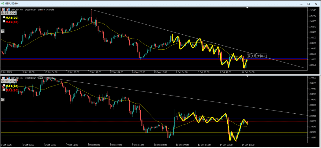 下落した場合でも1h水平線で止められ1hの押し目買いが入りそう。