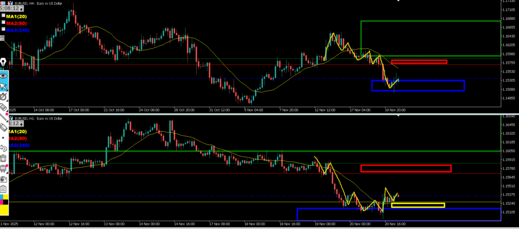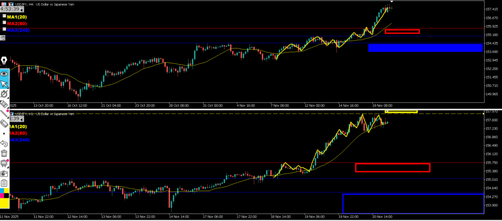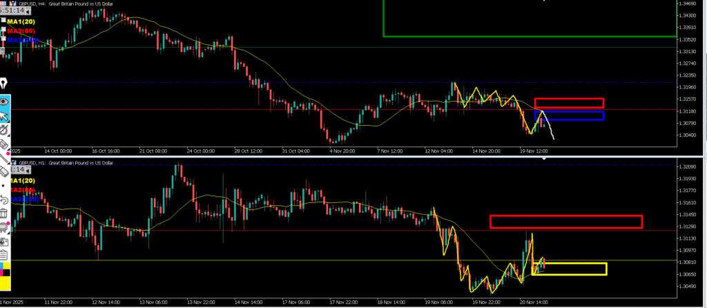 1hでは上昇になり押し目買いの波が出るかのところ、1hで波が出て上昇した場合4hの戻しの波になりやすいので4h水平線で戻しを待ちたいが、4hMAに抑えられる可能性があるので注意して見ていきたい