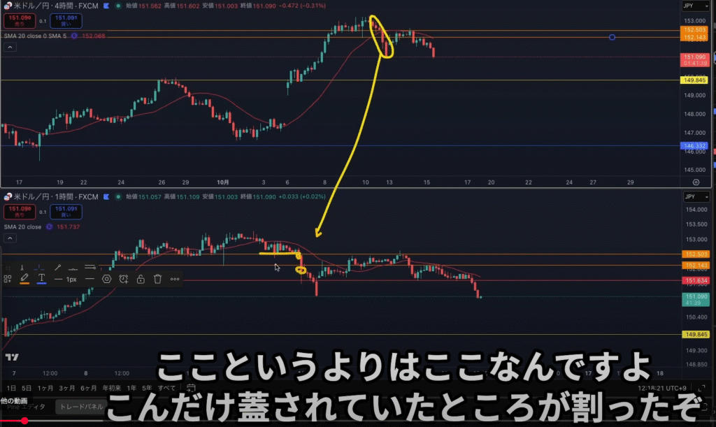 4hの上昇がどこでトレンド転換シグナルになったかを考えた時に、何故ネックラインの大きな陰線が出たヒゲ先よりも実体のラインが意識されそうなのかは、何度も抜けていなかったラインを抜けたポイントだったからトレンド転換シグナルとなって意識される、なのでそのポイントへ戻してきて止められる可能性が高い、その前の意識されるヒゲ先のラインでのエントリーを見送る事が出来る様になる。