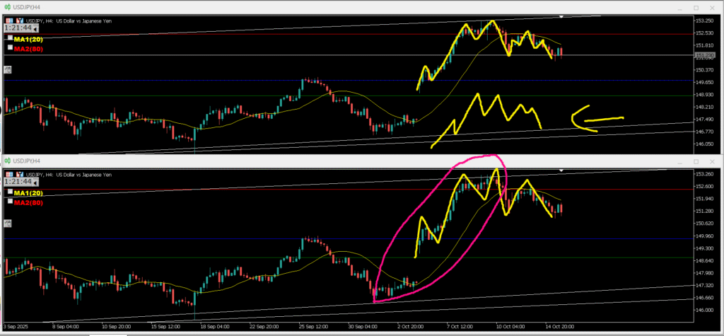 昨日疑問だった一度波が出たけど戻って来て1h戻り売りになった場面のエントリーポイントは間違ってはいなかった、エントリーポイントで入れたとしても損切になる事もあるのでその場合4h優位性があり止まっていれば再々エントリーをする。