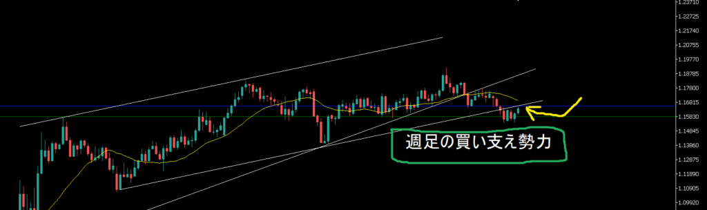 週足の買い支え勢力によって止められ上昇したと見ているが、黄色の矢印のポイントは日足前回安値でもあるチャネル抜け後のリバースタッチのポイントでもある。