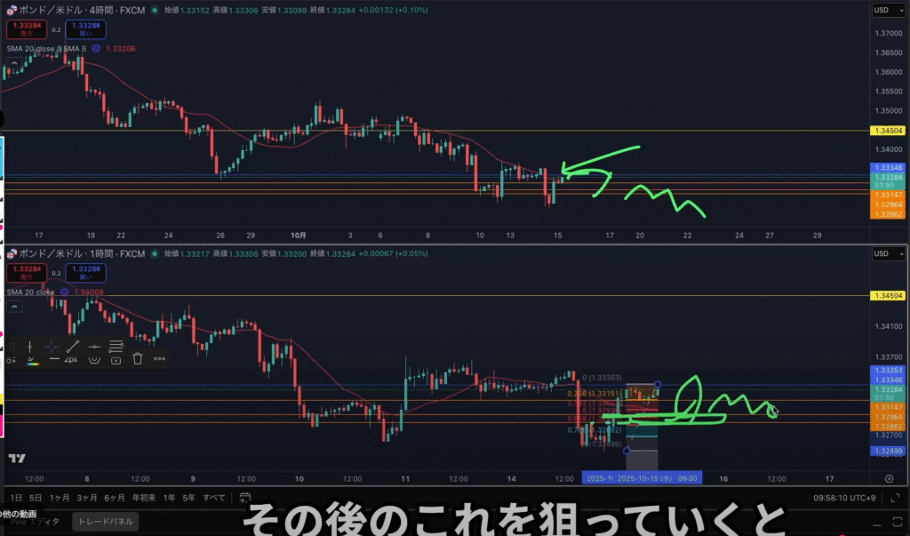 戻し過ぎの場合は1hの上昇からの押し目買いをやり過ごしてから、戻り売りを狙っていく。