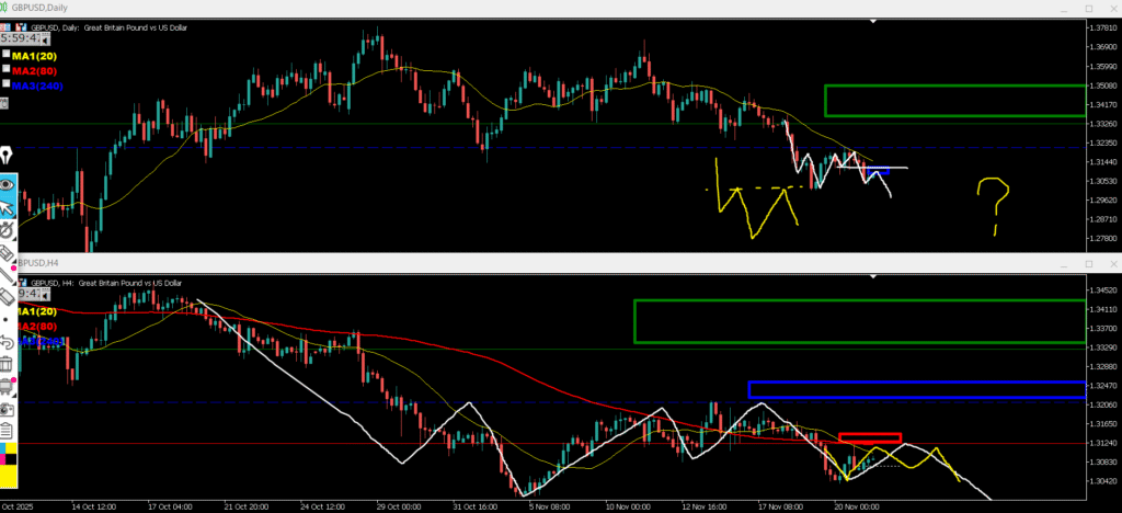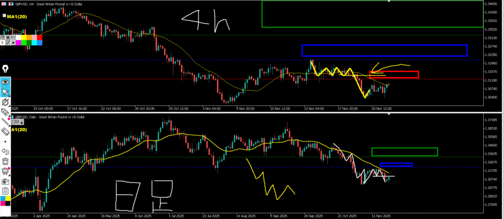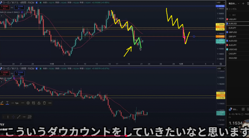 画像二枚目の本来は黄色のダウカウントで考えているが日足白のダウカウントで日足の戻り売りにも見えてきた、そうなると日足の波としては早過ぎるので4hで入っても画像下の黄色の描画のような動きになりやすい。