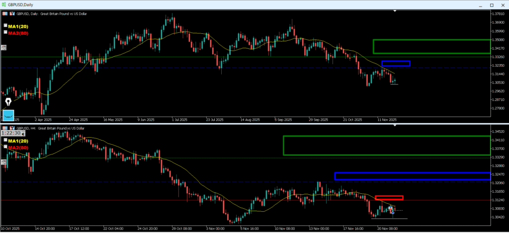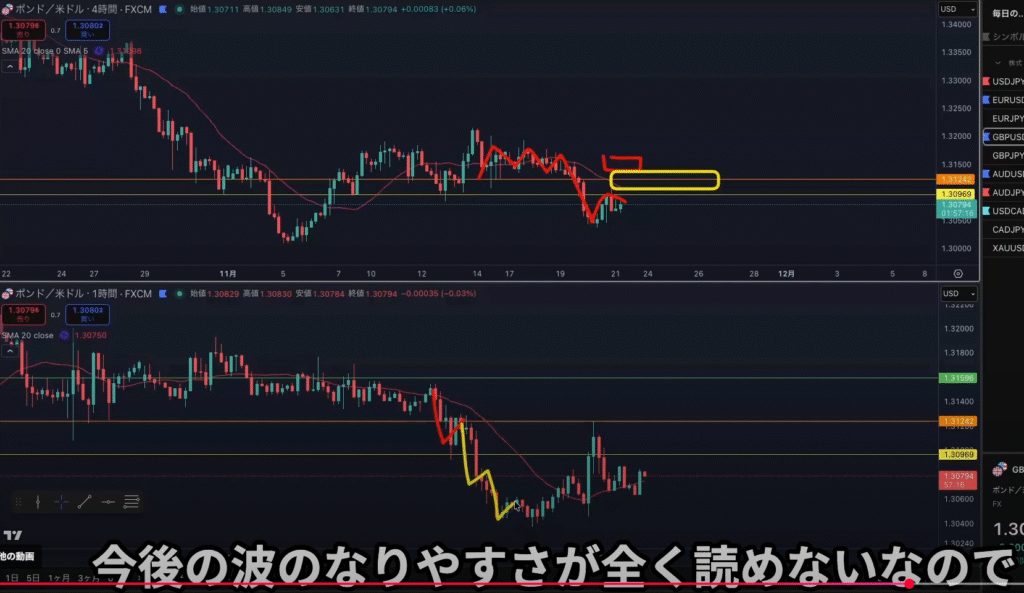 1hでは上昇になり押し目買いの波が出るかのところ、1hで波が出て上昇した場合4hの戻しの波になりやすいので4h水平線で戻しを待ちたいが、4hMAに抑えられる可能性があるので注意して見ていきたい