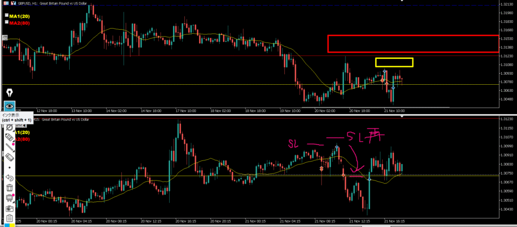 1hのMAを抜けてなっかたーーー!一旦は抜けたがヒゲで戻されている、15mでこんなに長い下ヒゲから下降していく事はあるのだろうか?!