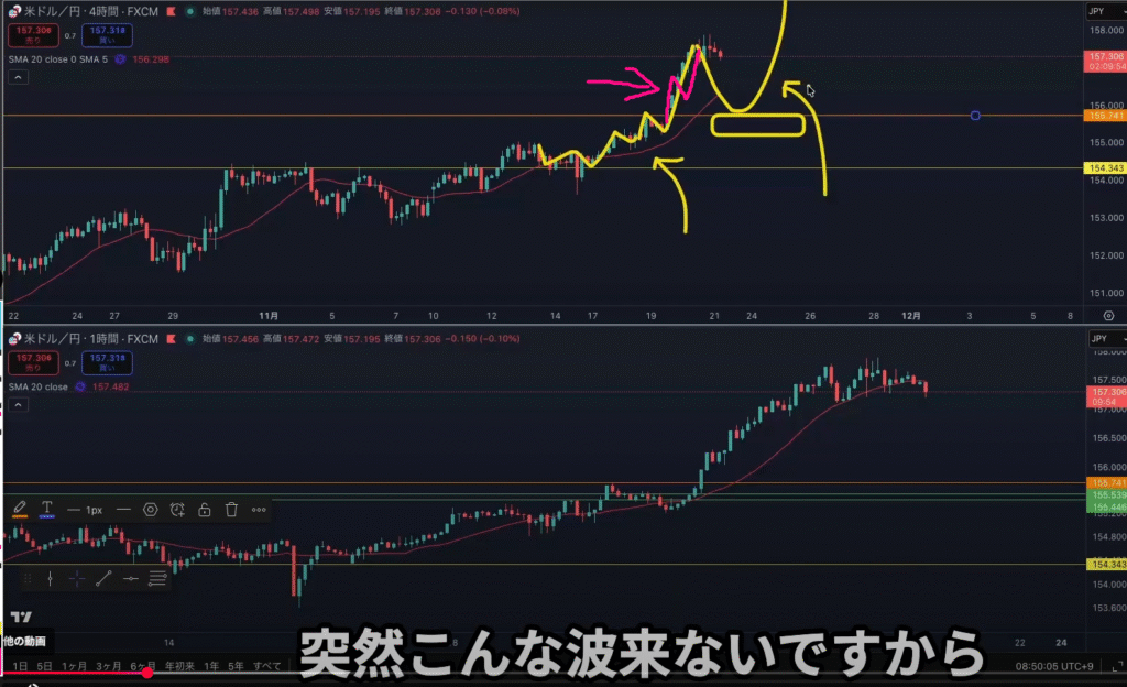 実際にエントリー後戻された後なので結果論でもあるが、方向が微妙で色々な可能性がある場面なので典型的なエントリーしてはいけない場面と学べ!!そして二度とこういう場面でするな!!!!