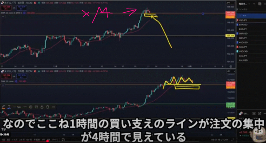1hの注文の集中が4hで見えているだけなので4hではない、なので抜けても4hが下目線にはならない。